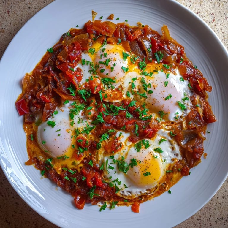 Save A vibrant, budget-friendly dish featuring perfectly baked eggs nestled in a spiced tomato and pepper sauce ideal for breakfast, brunch, or an easy supper.