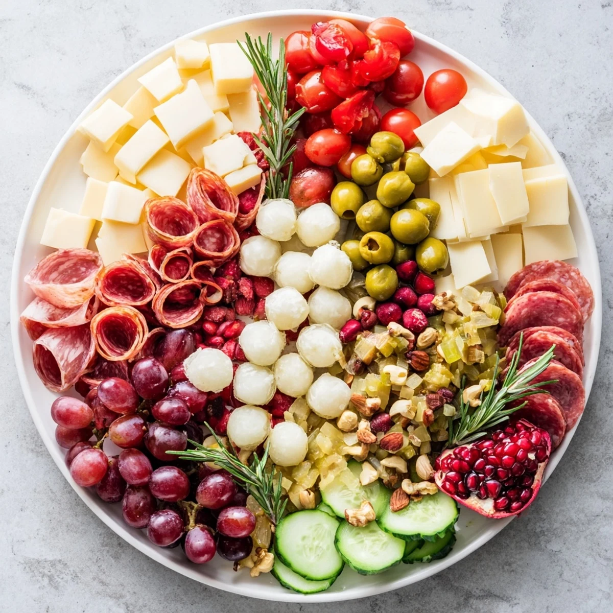 Arrange fresh rosemary sprigs in a circle as a base, then cluster cheeses and fold cured meats into rosettes. Scatter fruits, nuts, and olives evenly to fill gaps and add color.