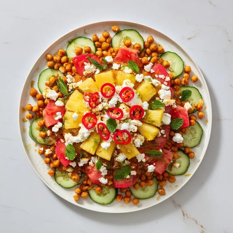 Save I still remember the first time I arranged food in concentric rings on a platter—it was for a dinner party where I wanted to impress without spending hours in the kitchen. As I spiraled the sweet pineapple and watermelon inward, then layered the savory cucumber and feta, and finally crowned it with spicy roasted chickpeas, my guests actually gasped when I brought it to the table. That moment taught me that sometimes the most memorable dishes aren't about complexity; they're about creating visual poetry that invites everyone to eat with their eyes first and their hearts second.