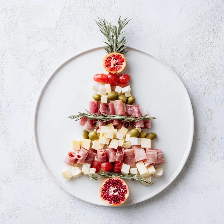 Save A stunning and delicious appetizer platter arranged in the shape of a festive tree, featuring cheeses, charcuterie, fresh fruits, nuts, and savory nibbles—perfect for holiday gatherings.