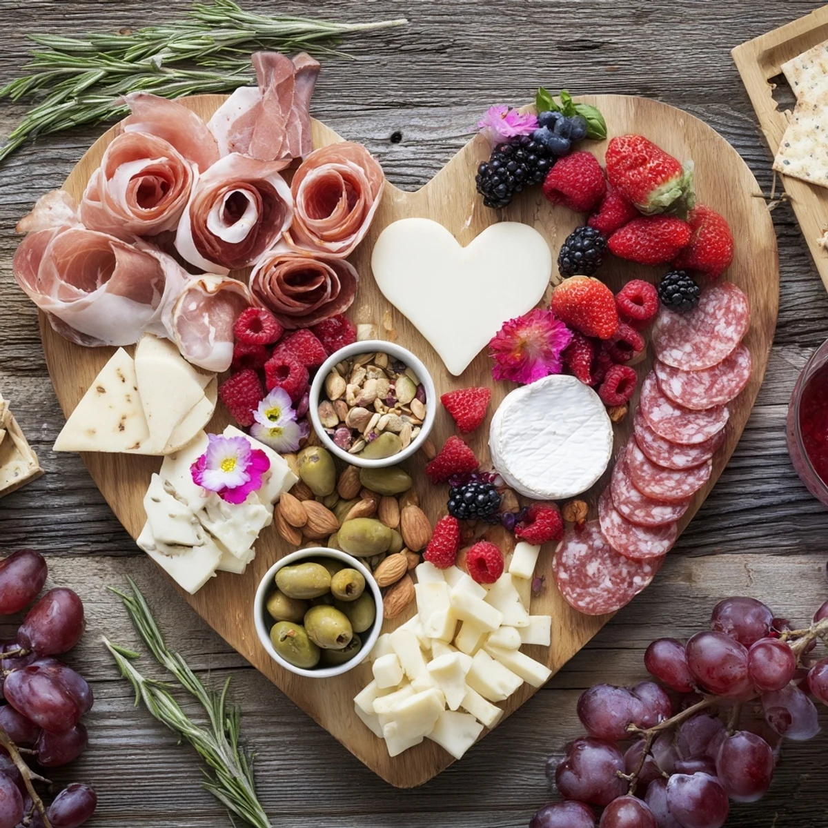 - Cheeses: 80 g brie (cut into heart-shaped pieces or wedges), 80 g aged cheddar (cubed), 80 g goat cheese (rolled into small balls)