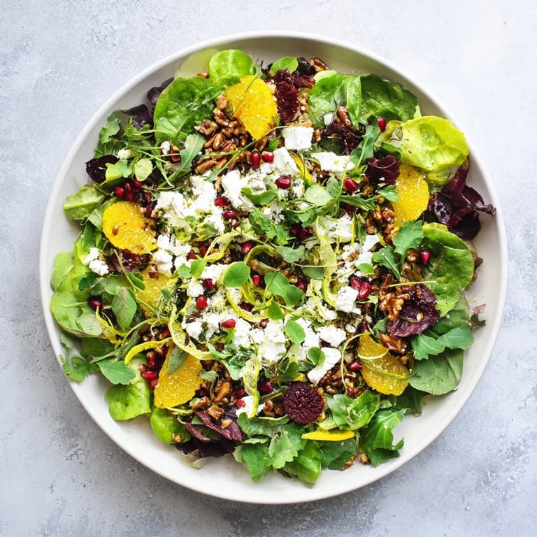 This salad's colorful ingredients make it as inviting to look at as it is delightful to eat. The crisp greens and fresh herbs form a vibrant base, while the feta cheese adds creamy richness. Toasted nuts provide a satisfying crunch, and the homemade olive oil dressing ties all the flavors together with a gentle tang and subtle sweetness.
