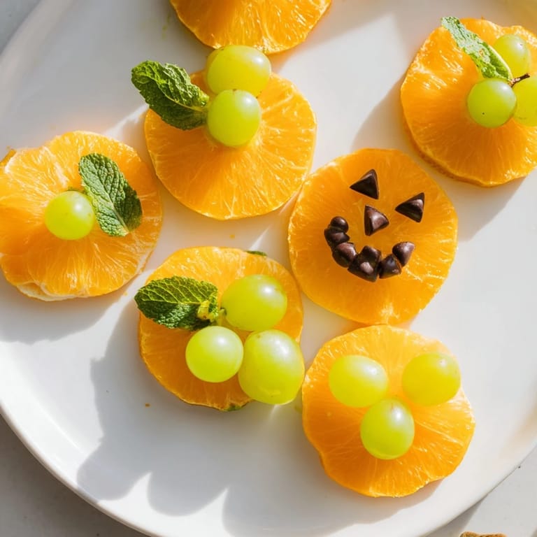 Cut green grapes in half lengthwise and place one half on top of each orange slice. Use a small dab of honey or maple syrup to secure if needed. Add a mint leaf next to each grape for a realistic stem effect.