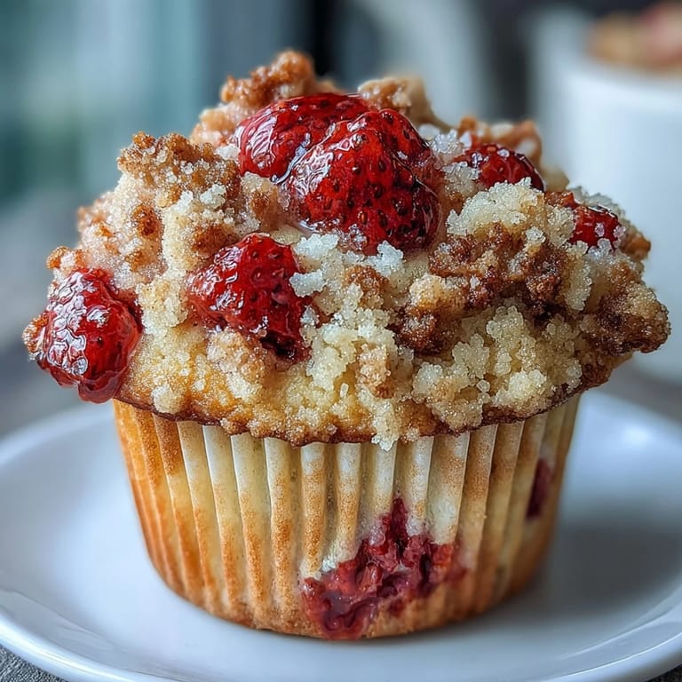 Save My neighbor knocked on my door one June morning with a basket of strawberries so ripe they practically glowed, and I suddenly found myself with more berries than I knew what to do with. Rather than let them soften on the counter, I decided to bake, and these muffins became my solution—tender crumbs studded with sweet fruit, crowned with a buttery topping that catches the light like jewels. The lemon zest adds this unexpected brightness that makes you pause mid-bite and wonder why you haven't made them a dozen times before. It's the kind of recipe that tastes homemade in the best way, nothing fussy or complicated.