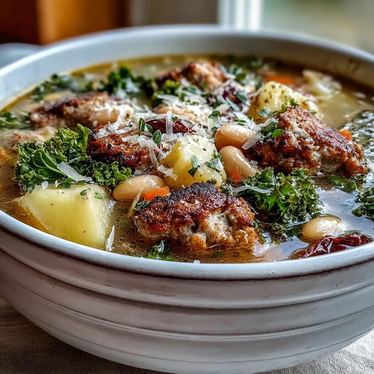 Save Experience the warmth of an Italian kitchen with this Tuscan White Bean Sausage Soup. This hearty, rustic dish combines savory Italian sausage with creamy cannellini beans and nutrient-dense kale for a meal that feels like a warm hug on a cold day, providing comfort and nutrition in every spoonful.
